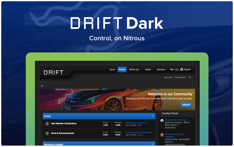 Based off its XenForo 1 successor, Drift Dark brings it's many features back to XenForo 2. From adding your own banner, choosing either a fluid or fixed website design, this theme will still work with any style you choose...